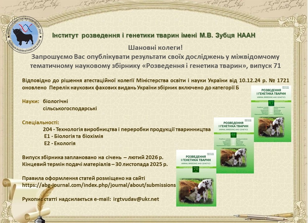 4. Polupan Yu. Р., Melnik Yu. F., Biriukovа O. D. Influenceofgeneticfactorsontheproductivityofcows. Розведення і генетика тварин. Київ, 2019. Вип. 58. С. 41–52.