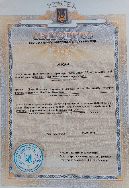 Сформовано електронну інформаційну базу даних оцінених дочок бугаїв волинської м’ясної породи, сперма яких закладена на довготривале зберігання в банк генетичних ресурсів тварин Інституту розведення і генетики тварин ім. М.В. Зубця НААН.